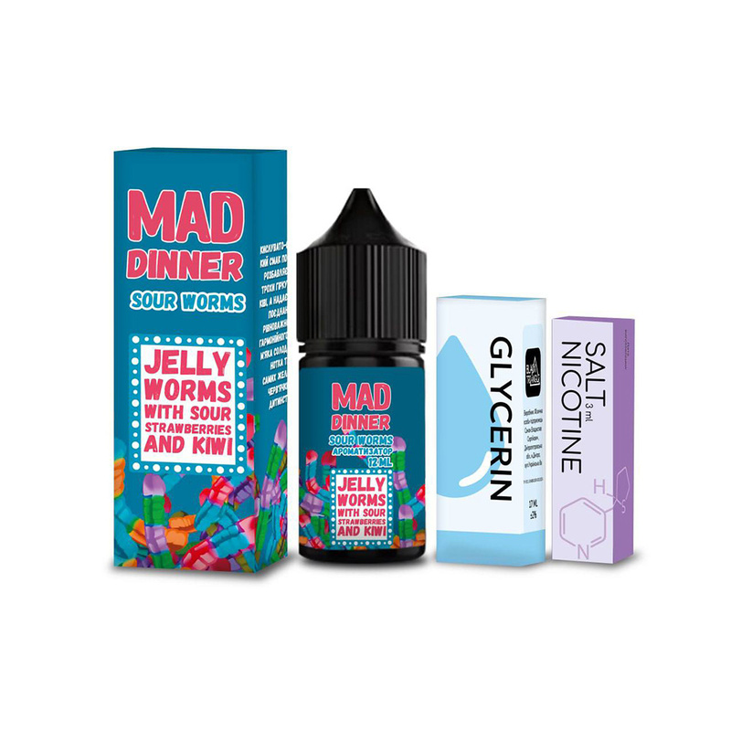 Набір Mad Dinner Sour Worms - це смачна рідина для електронних сигарет з нотами кислих черв'яків. Цей продукт стане відмінним вибором для любителів міксу солодкого і кислого.