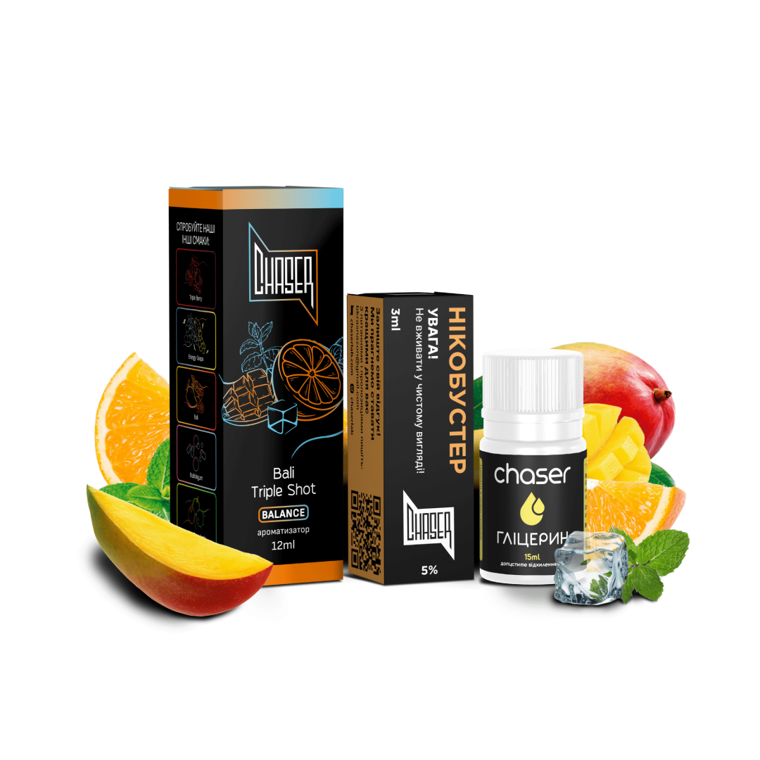 Набір Chaser Black 30мл 50мг BALI TRIPLE SHOT - це ідеальне поєднання чудового смаку і збалансованого вмісту нікотину. Завдяки унікальному складу рідини ви отримаєте насичений і глибокий смак кожним затягом.
