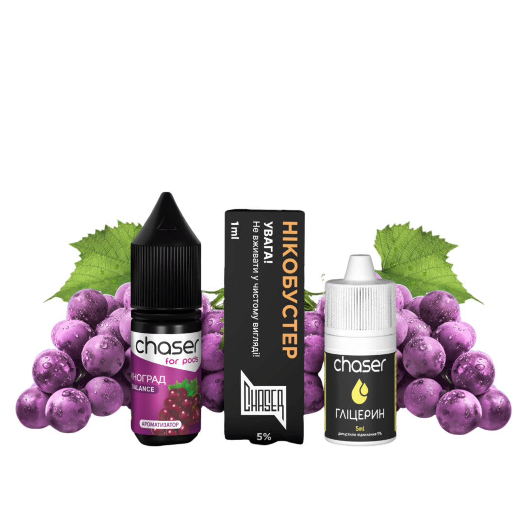 Набір Chaser For Pods включає в себе рідину для електронних сигарет ВИНОГРАД 10 мл з вмістом нікотину 50 мг. Це ідеальне рішення для тих, хто віддає перевагу міцному нікотиновому удару і насиченому смаку винограду.