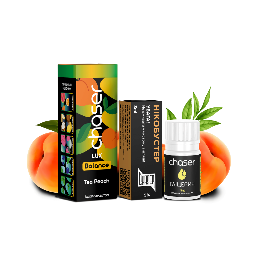 Chaser Lux 30мл 50мг ПЕРСИКОВИЙ ЧАЙ ідеально підходить для використання в електронних випарювачах і забезпечує інтенсивний і стійкий аромат на протязі тривалого часу.